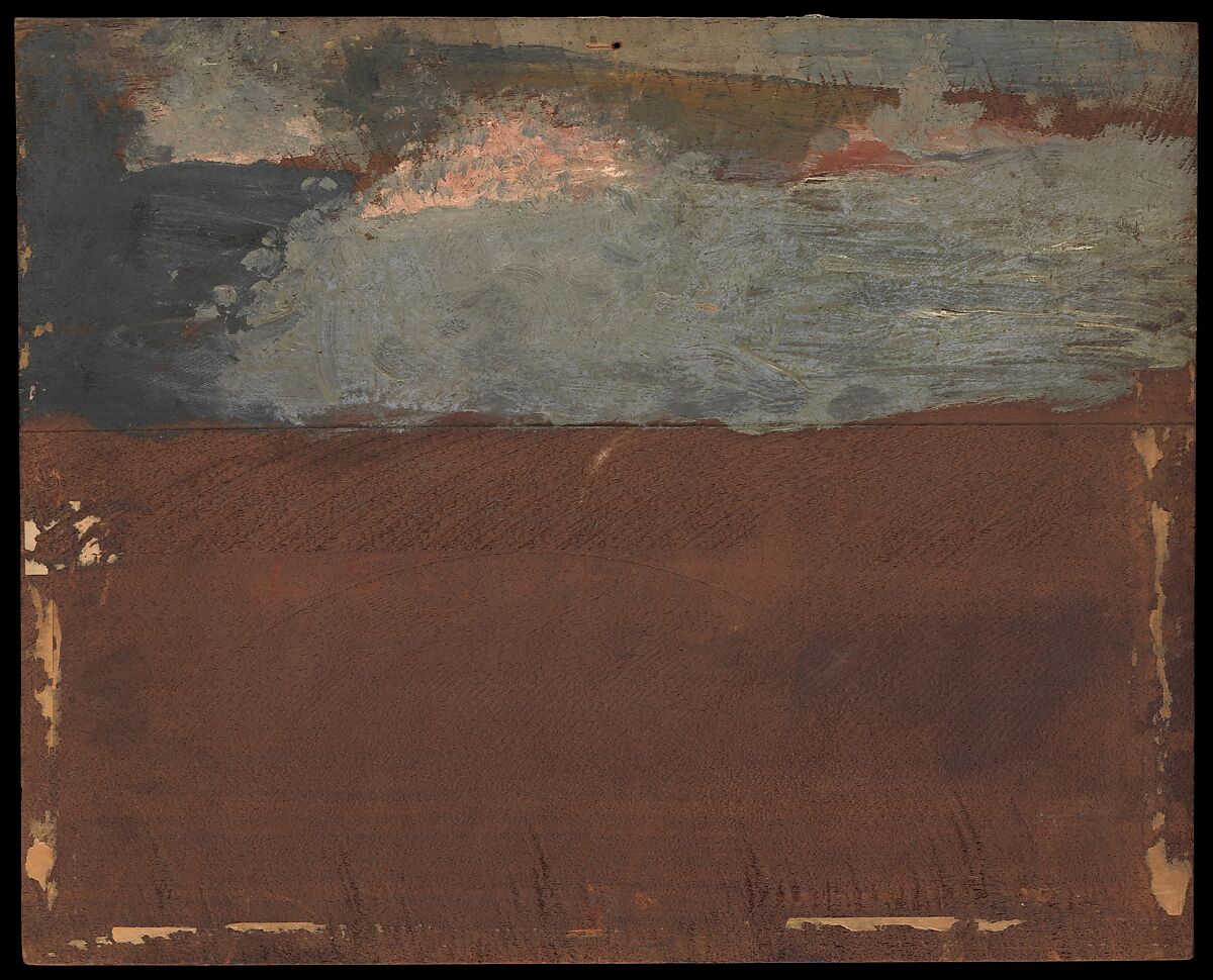 "An unfinished study of rocks and breaking surf appears on the upper part of the back of the panel. The predominance of pink colors suggests sunrise or sunset. The bursts of spray and foam are characteristic of the paintings of the sea that Homer made after he settled in Prout's Neck in 1884. The marine paintings of that period, however, appear to have been painted exclusively on white prepared grounds. This study is made directly on the red-brown panel, a ground that gives more weight and substance. Neither of the studies, which date from two different periods of Homer's life, was ever intended for public exhibition. More likely, they served as points of reference for him."